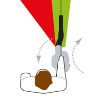ECHO mindsker behovet for brug af ekstra kraft til at forhindre løvblæseren i at rotere ind mod brugerens ben, sådan som de fleste håndholdte modeller gør (rød sektion). Faktisk trækker den en smule bort fra brugeren (grøn sektion). Effekten gør løvblæseren nemmere at håndtere og mindsker belastningen af brugerens arm.